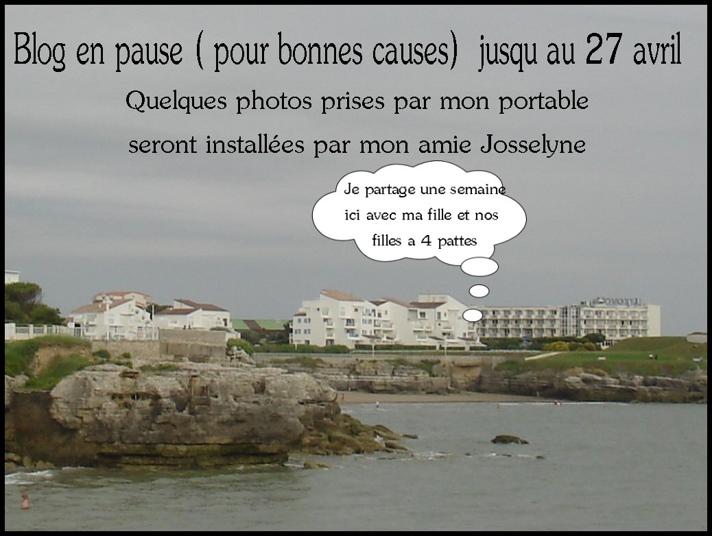 C'est l heure de mettre mon blog en pause pour quelques jours ..Je suis vraiment heureuse d aller me reposer un peu, avec ma fille et nos deux louloutes..et vous voyez ( sur la photo ) je ne peux pas être plus près de l océan..une pte location en bas , avec un pt jardin pour nos filles a 4 pattes...Tout près de l océan , et de la thalasso..hum ! ç a va faire du bien...Mes deux petites secrétaires ,